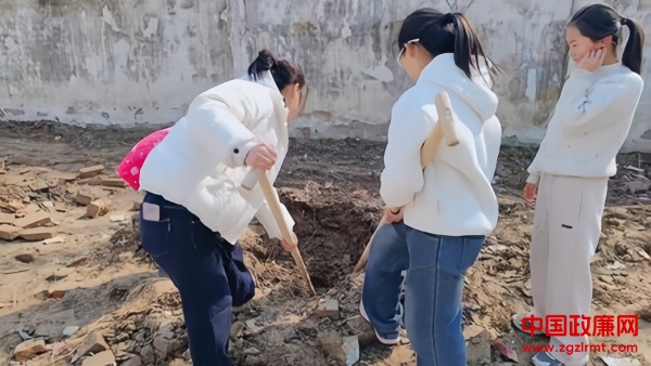 在这片充满希望的土地上,学生们积极参与到植树活动中来。他们穿着冬衣,在一个曾经荒芜的地方辛勤工作,挥动着铁锹,挖出一个个深深的坑洞。有的同学负责挖掘,有的则搬运树木和准备工具,每个人都在为了共同的目标努力工作。尽管背景显得斑驳破旧,但这并不影响孩子们对美好未来的向往与期待。孩子们用实际行动向人们展示了“绿水青山就是金山银山”的真谛,以及保护环境的重要性。