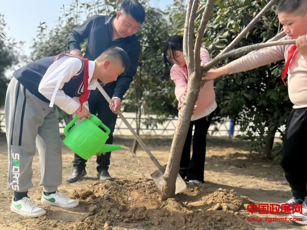 在宋校长的带领下,同学们热情高涨,分工协作。有的挥锹铲土,有的扶苗填坑,有的提水浇灌,每一个环节都认真细致。大家齐心协力,亲手种下一棵棵树苗,并在心愿卡上写下对小树的祝福与期望,挂在枝头。经过一上午的辛勤劳动,校园内新添了一片生机勃勃的绿色。