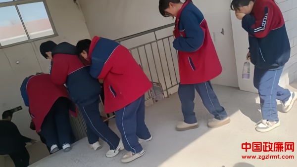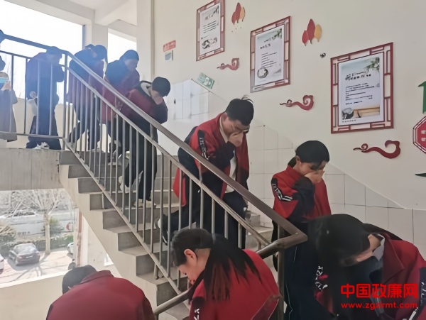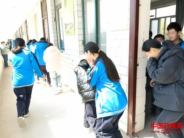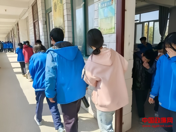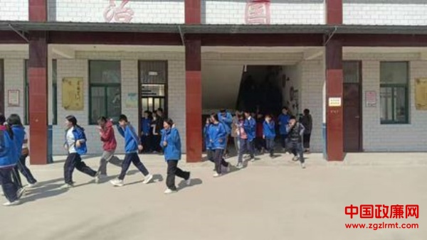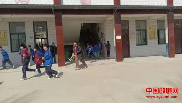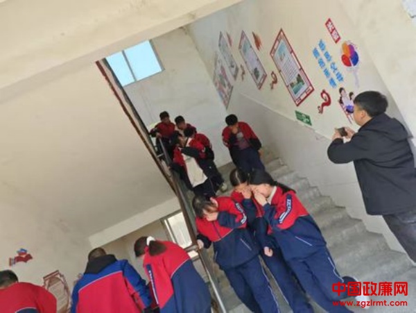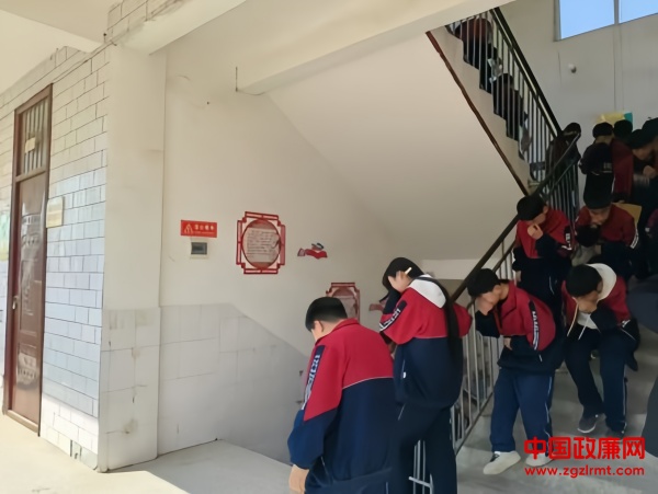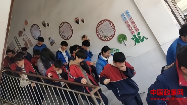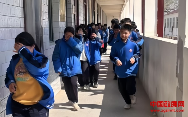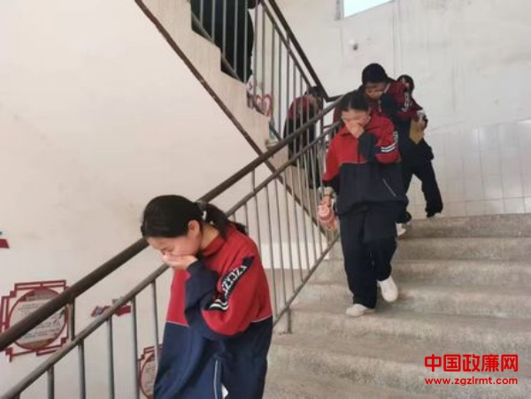同学们在老师们的指挥下,按照指定路线,弓着腰、用手捂住嘴鼻,迅速有序地进行紧急疏散。