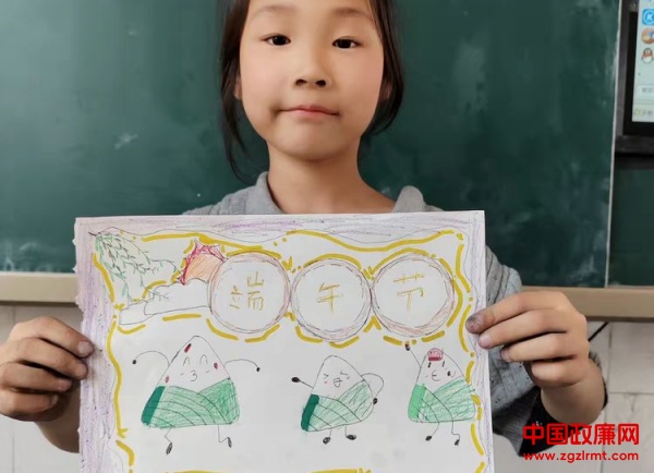 在教室的各个角落,总能看到同学们专注展示自己作品的身影。他们手持精心绘制的画作,有的站在黑板前,有的与同伴并肩而立,每一张画纸上都跃动着属于孩子的独特创意——或是可爱的卡通粽子,或是写满“端午节”字样的装饰,或是融入个人风格的图案设计,每一笔都承载着对传统节日的美好期待。