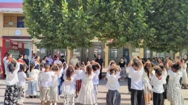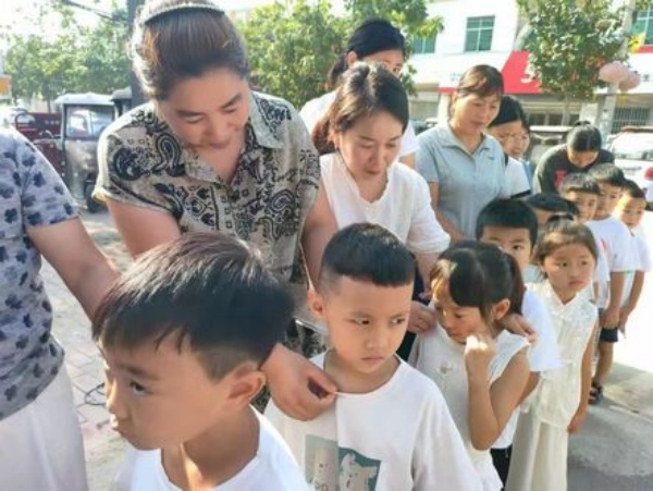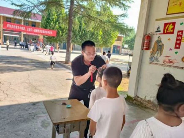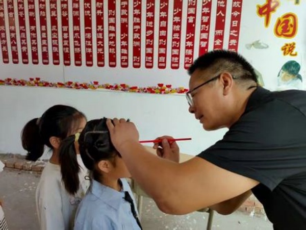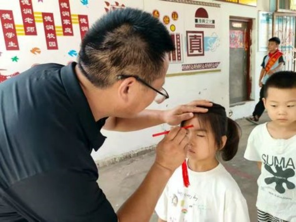 朱校长用朱砂在新生额头点上红痣,寄托着对孩子美好的祝愿。孩子们安静地接受这份祝福,额头的红点成为校园里一道亮丽的风景。