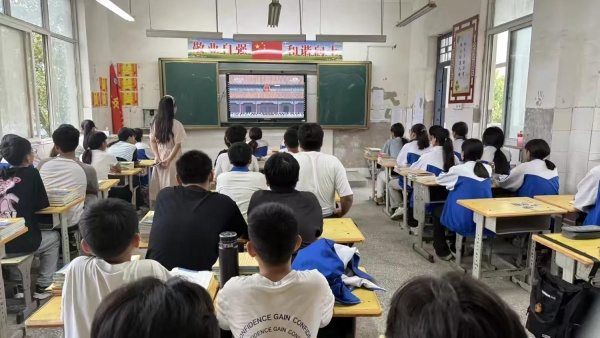 2025年9月3日上午9时整,阅兵仪式正式开始。各班级教室的电子屏幕上,整齐的受阅方队、威武的装备方阵和空中梯队依次亮相。学生们早早进入教室,坐姿端正,目光紧紧锁定屏幕,不时随着仪式进程挺直脊背。老师们站在教室后排,与学生一同观看,神情庄重而专注。