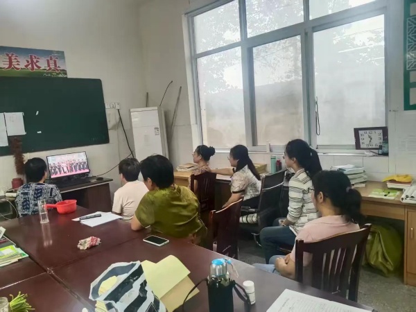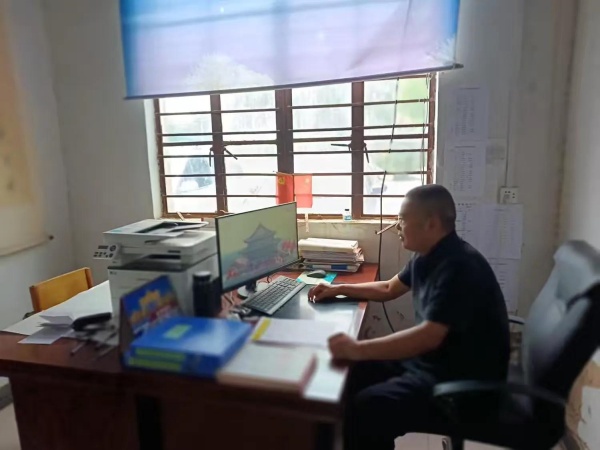 办公室里,老师们围坐在一起,通过电脑认真观看阅兵直播。屏幕上,先进的武器装备依次展示,彰显着国家的强大实力,大家不禁为祖国的繁荣昌盛而由衷赞叹。还有老师独自在办公桌前,聚精会神地观看,沉浸在这庄严的氛围之中。