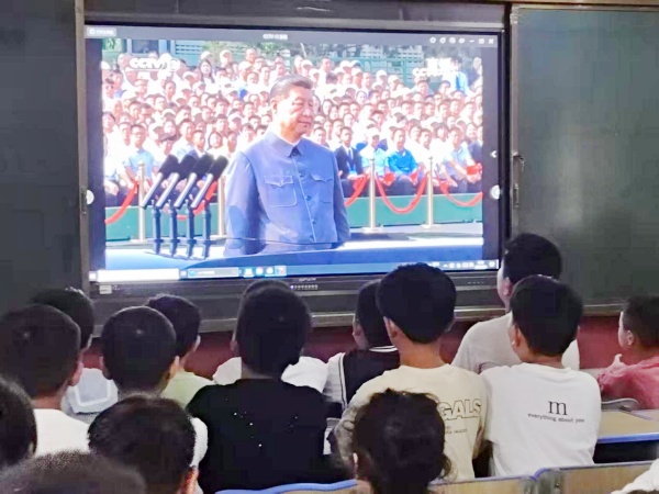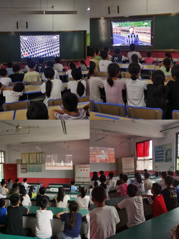 上午9点,大阅兵正式开始,我校全体师生齐聚在学校多媒体教室,怀着激动的心情观看直播。当国歌响起,鲜艳的五星红旗冉冉升起时,全体师生起立,庄严地行队礼和注目礼,口中高唱国歌,场面庄重而热烈。