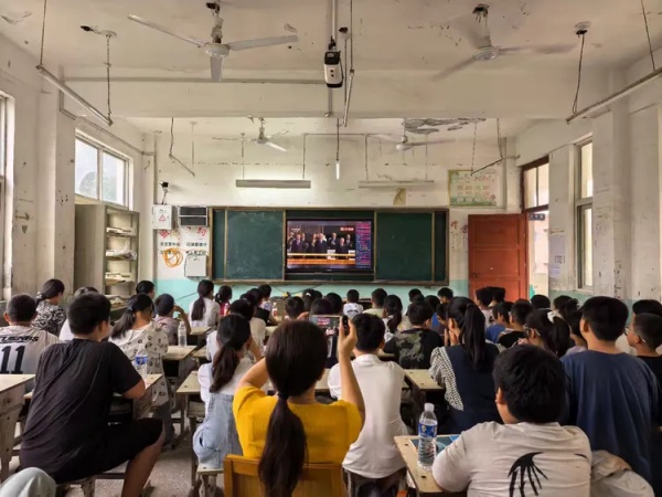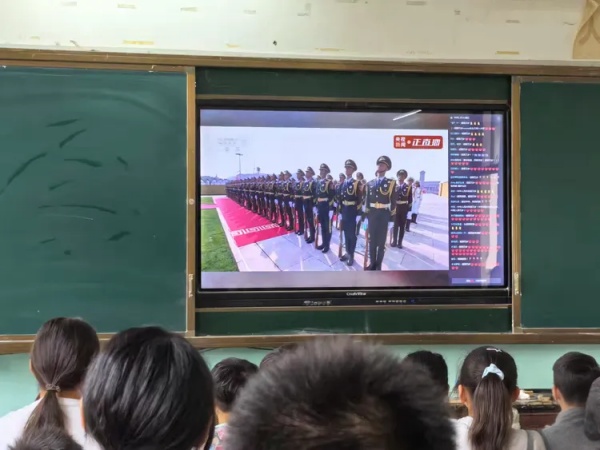全体学生在班主任的有序组织下,齐聚教室,共同观看阅兵仪式。同学们怀揣着激动的心情,端坐在座位上,眼睛紧紧盯着屏幕,生怕错过任何一个精彩瞬间。整齐划一的受阅方队、先进精良的武器装备,无一不让同学们心潮澎湃,现场不时爆发出热烈的掌声和欢呼声。