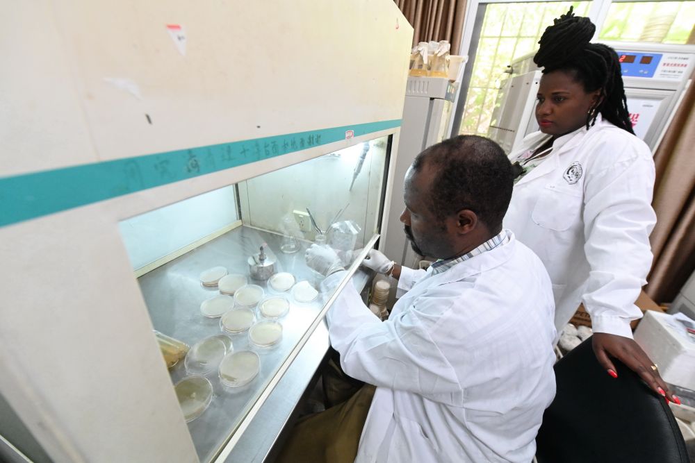 卢旺达菌草项目协调员梅迪(右)和丈夫马文博在福建农林大学国际菌草工程技术研究中心实验室开展菌种分离实验工作(2024年8月30日摄)。新华社记者 林善传 摄