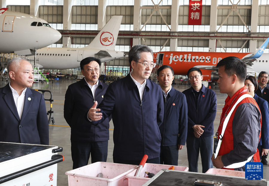 3月24日至25日,中共中央政治局常委、国务院副总理丁薛祥在海南调研。这是3月24日,丁薛祥在海南自贸港一站式飞机产业维修基地了解飞机维修服务情况。新华社记者 姚大伟 摄