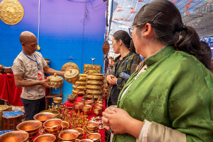 来自尼泊尔的商人阿曼在西藏昌都市首届尼泊尔进口商品展销会上向顾客展示商品(2024年8月19日摄)。新华社记者 旦增尼玛曲珠 摄