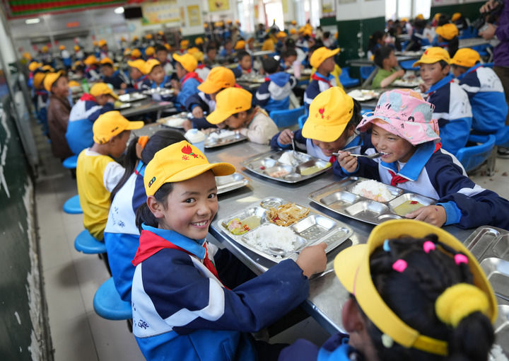 西藏林芝市工布江达县娘蒲乡中心小学学生在食堂用餐(2024年9月3日摄)。新华社记者 晋美多吉 摄