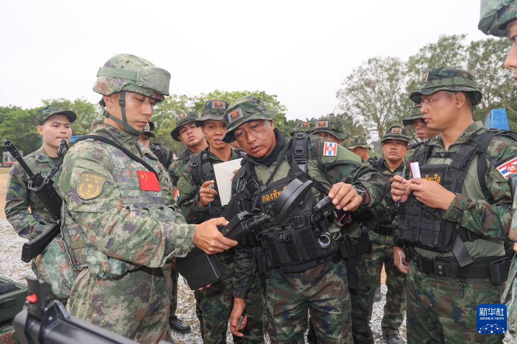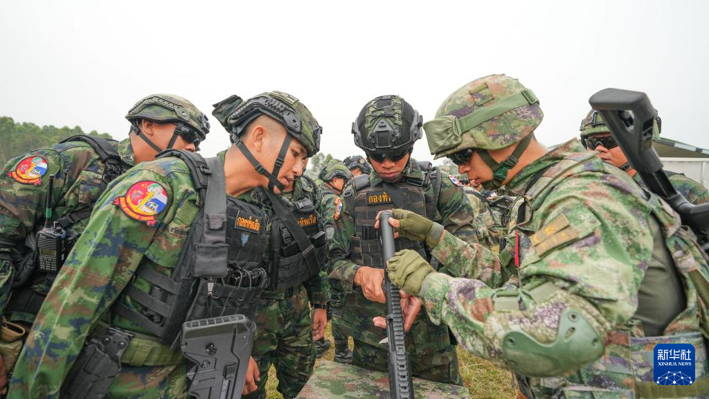 3月27日,在中泰“蓝色突击-2025”海军联合训练中,中泰双方队员进行轻武器射击交流。新华社发(贾成露 摄)