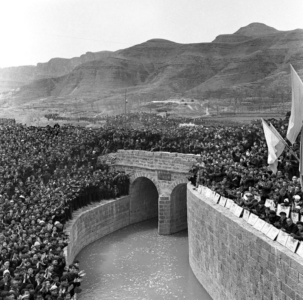 1965年4月,红旗渠总干渠正式通水当日,林县人民从四面八方赶来参加通水典礼(资料照片)。