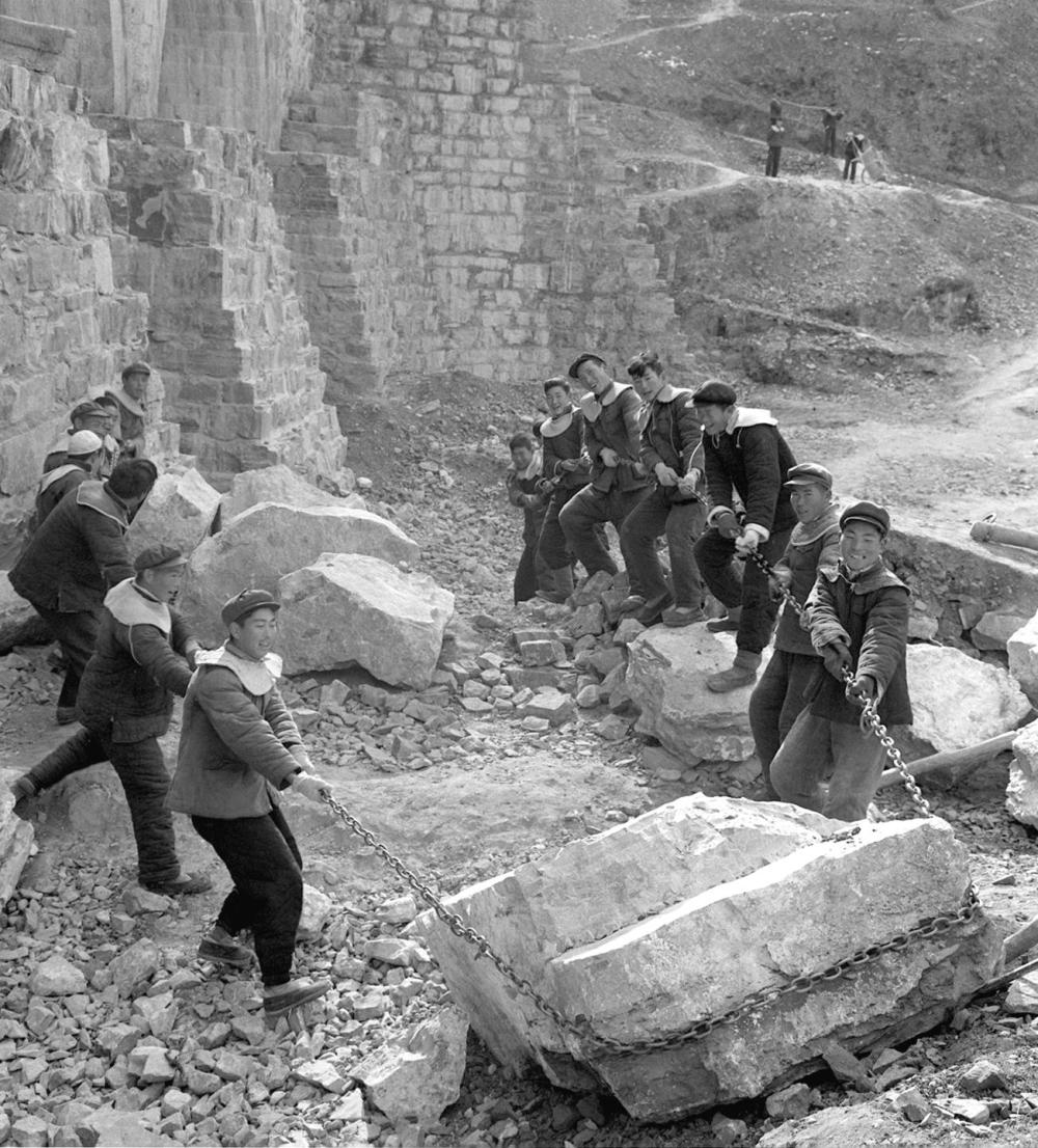 1960年,林县人民决心开始兴建红旗渠大型水利工程。在险峻的群山峡谷里,太行儿女逢山凿洞、遇沟架桥。这是红旗渠上合涧公社民工们起运大石料(资料照片)。