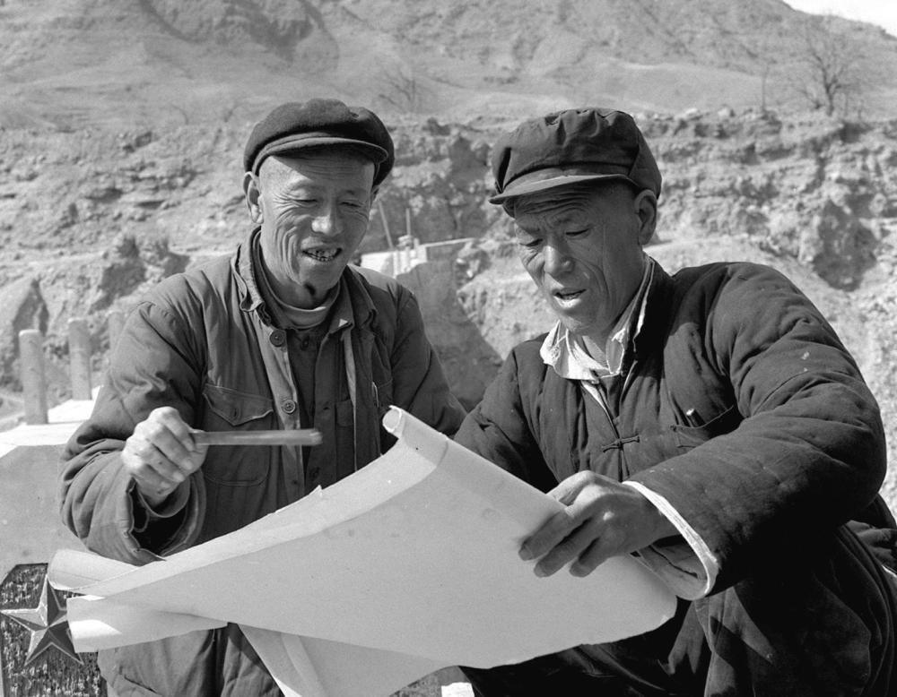 农民技术员秦永禄(右)和桃园大桥工地指挥长郭增堂在工地上。红旗渠开工之初,林县的水利技术人员还不到30人。修渠10年,林县儿女设计了“坝中过渠水、坝上流河水”的空心坝,建成了“槽下走洪水、槽中过渠水、槽上能行车”的渡桥,创造了上百项工程技术成果,培养锻炼了5万多名石匠,3000多名懂技术、会管理、能领导的工队长、技术员。