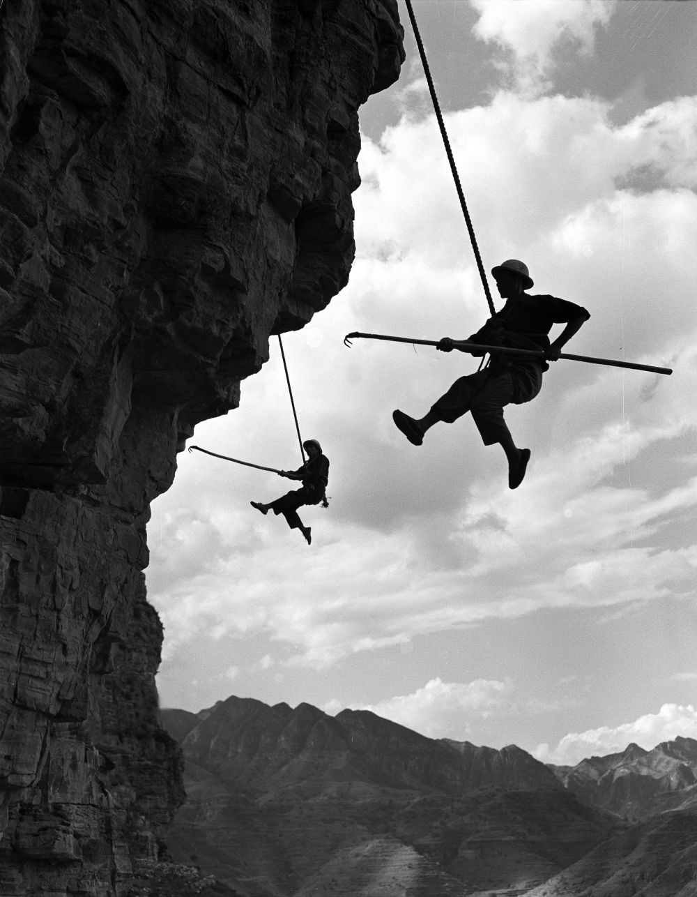 施工队员在红旗渠施工现场凌空除险(资料照片)。
