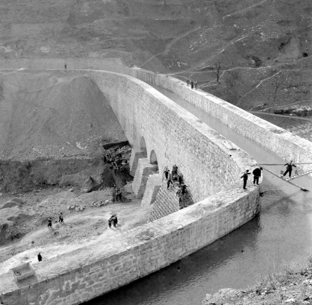 在缺少大型机械的年代,红旗渠建设者们肩扛手拉,在崇山峻岭间开隧架槽。单是红旗渠总干渠,就有14座渡槽。这是其中高27米、长87米的皇后沟大渡槽(资料照片)。