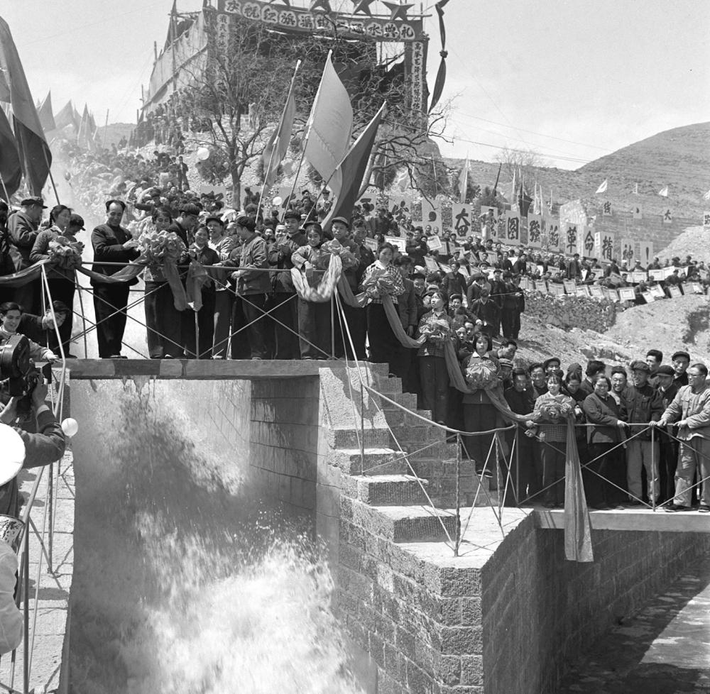 1966年4月20日,河南林县人民举行盛大集会,庆祝红旗渠三条干渠全面竣工通水。漳河水顺着红旗渠滚滚流来,广大干部群众热烈欢呼(资料照片)。