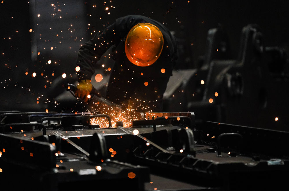 2025年3月19日,工人在林州重机集团股份有限公司的铆焊车间进行打磨作业。近年来,林州重机通过技术创新寻求市场突围,2022年摆脱亏损,2023年大幅盈利并摘掉ST帽子,企业稳步向好发展。