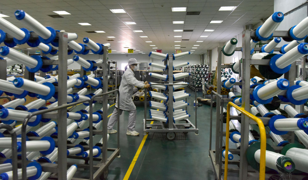 2025年3月19日,工人在位于红旗渠经济开发区的河南光远新材料股份有限公司电子布生产车间搬运纺锤。2024年AI产业风口大开,凭借过去几年的持续技术投入,光远新材新研发的低介电产品供不应求,一举扭亏为盈。