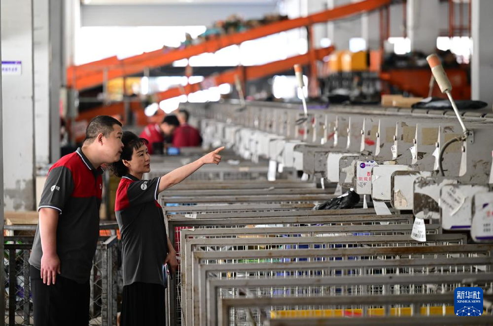 5月16日,在阜阳市圆顺通物流有限公司,刘苓苓(右)在物流基地和工作人员交流。