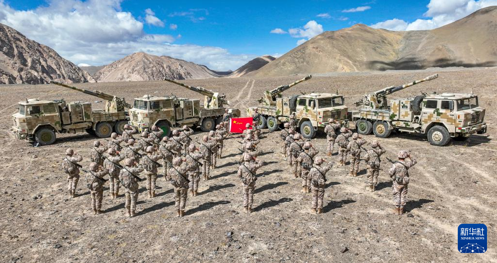 7月31日,在海拔4300多米雪域高原驻守的新疆军区某合成团组织开展“边关有我,请祖国放心”主题活动,官兵们面向军旗庄严宣誓(无人机照片)。