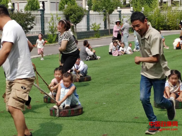 规则:哨声响后把孩子放在轮胎上,拉着孩子跑到另一头绕过安全锥返回,速度快者胜出。