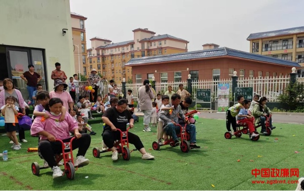 规则:大人骑着三轮车,孩子站在三轮车后面,搂着大人,往返骑,速度最快的获胜。