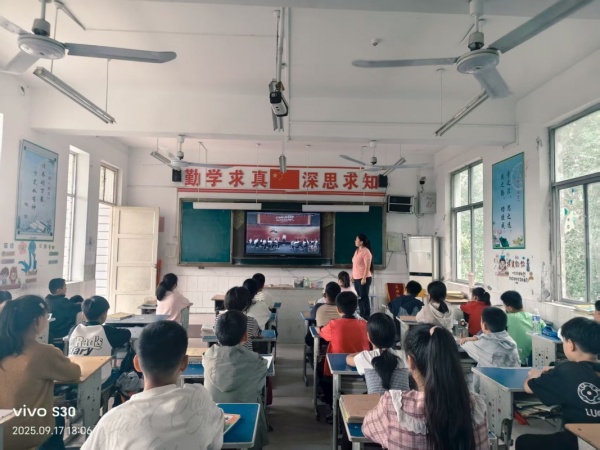 2025年9月17日,在袁坊中心学校胡校长的号召下,全校老师与学生一起开启了共上一堂课思政课活动,课堂上孩子们聚精会神地观看,了解中国抗日历史,共读中国抗日故事,让学生从中体会到革命前辈为了祖国人民无私奉献的精神,先辈们那种坚毅、勇敢、博爱的精神深深感动着孩子们。在课堂上,把国歌与革命故事相结合,让学生体会到了现在美好的生活都是革命先烈用鲜血换来的,我们新时代的少年要接着革命先烈的精神,为祖国的未来努力奋斗。课程最后,同学们与老师一起唱起了国歌。